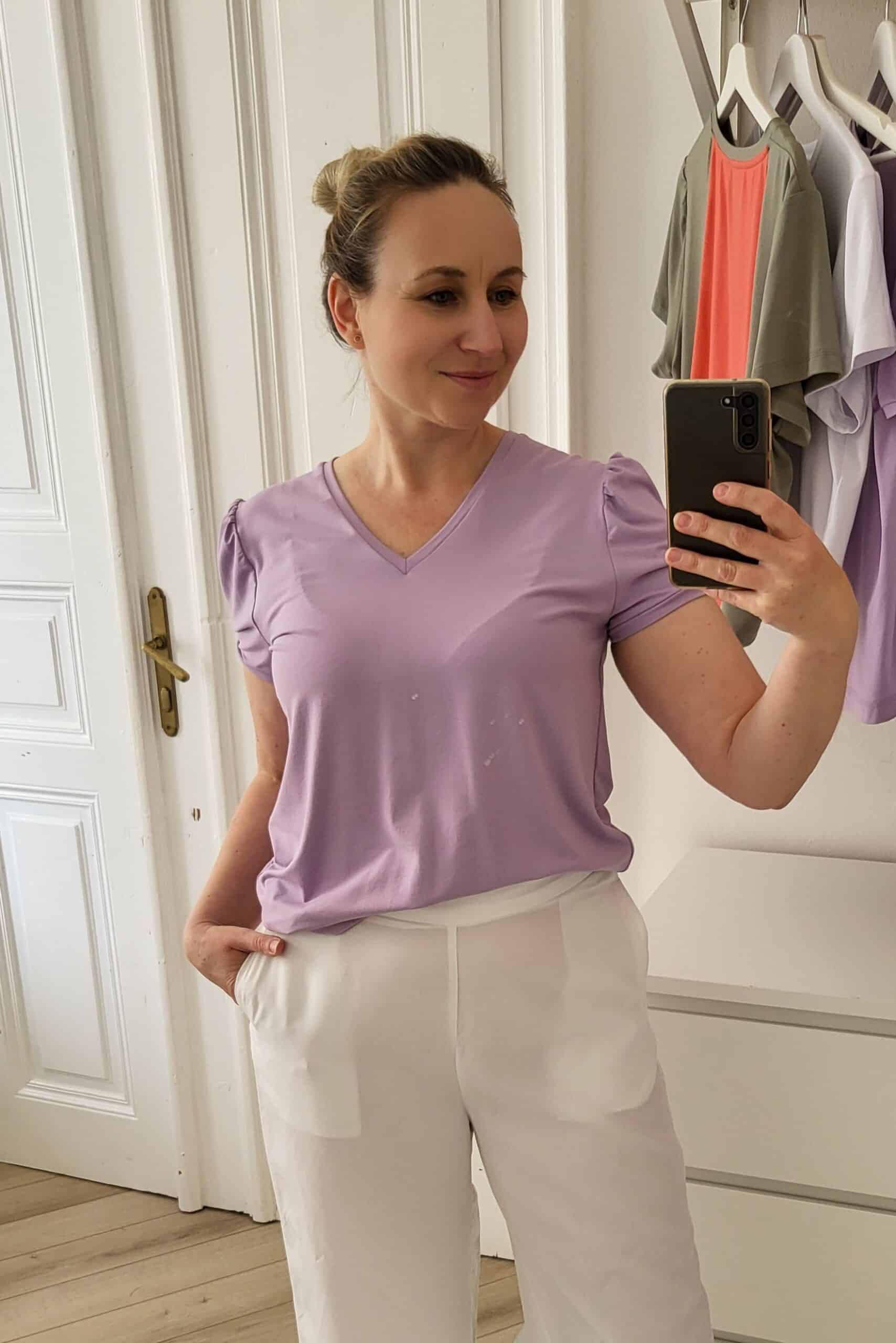 Top z kvalitného viskózového úpletu s nariaseným rukávom a výstrihom V. Tento model je voľnejší, ležérnejší, no zároveň veľmi ženský a romantický vďaka nariaseným rukávom. Viskózový úplet má prirodzene ľahký lesk, a je veľmi príjemný na nosenie, splývavý, mierne chladivý, priedušný, výborne saje a je dobre znášaný alergikmi. Vďaka podielu elastanu sa menej krčí a je vysoko elastický.